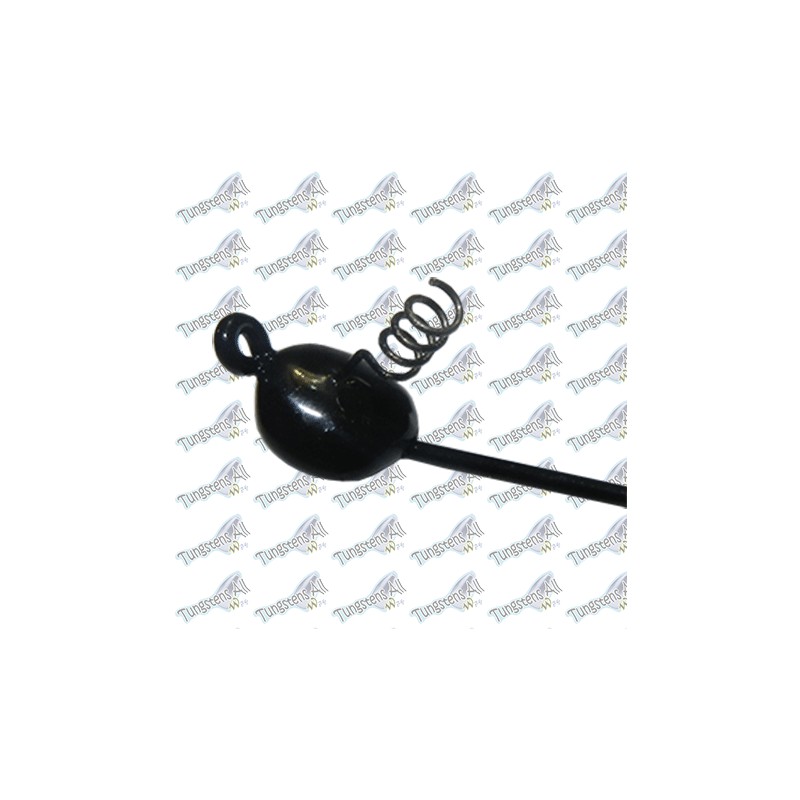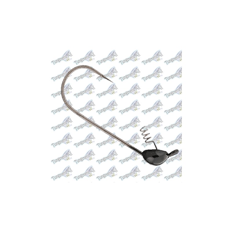 La cabeza compuesta con un 97% de tungsteno recibe un diseño curvado y contornos redondeados facilita la pesca en zonas con vegetación. Montado sobre un anzuelo Mustand 4/0 de calidad Premium con una inclinación a 60º y un muelle fino y largo totalmente moldeable de acero inoxidable, diseñado para introducir el señuelo fácilmente.