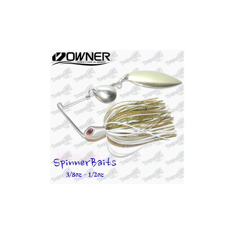 Spinnerbaits con cuerpo de Tungsteno 97% y alambre, con 2 palas ovaladas(Tipo Indiana). El Tungsteno hace que el señuelo sea mucho mas discreto y pequeño, cabeza de color blanco y negro, y acompañada de faldellines de silicola de gran calidad. Anzuelo Onwer