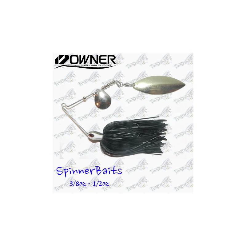 Spinnerbaits con cuerpo de Tungsteno 97% y alambre, con 2 palas ovaladas(Tipo Indiana). El Tungsteno hace que el señuelo sea mucho mas discreto y pequeño, cabeza de color blanco y negro, y acompañada de faldellines de silicola de gran calidad. Anzuelo Onwer