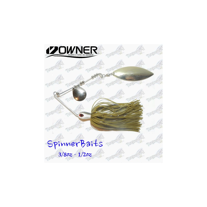 Spinnerbaits con cuerpo de Tungsteno 97% y alambre, con 2 palas ovaladas(Tipo Indiana). El Tungsteno hace que el señuelo sea mucho mas discreto y pequeño, cabeza de color blanco y negro, y acompañada de faldellines de silicola de gran calidad. Anzuelo Onwer